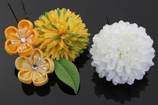 髪飾り 3点セット つまみかんざし コームタイプ 和装 花 成人式 卒業式 袴 結婚式 パーティ 浴衣 夏祭り 紋ちりめん双彩旬鞠丸菊 ホワイトピンポンマム添え 〈黄色〉 つまみかんざしの「つまみ」とは薄地の布を正方形に小さく切り、 これを摘んで折りたたみ組み合わせることにより花や鳥の文様をつくる細工のことです。