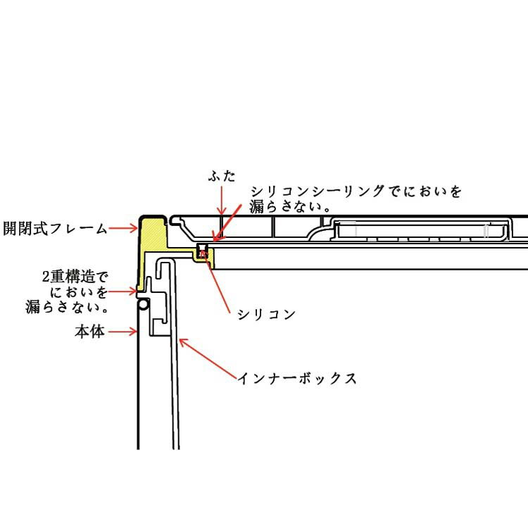 表面と開口部の抗菌加工で臭いの発生を抑えた上で更に二重の蓋が臭い漏れを防ぎます。