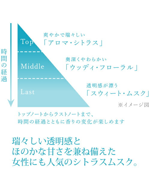 瑞々しい爽やかさの中に、程よい甘さと奥行きのある「シトラス・ムスク」の香り。